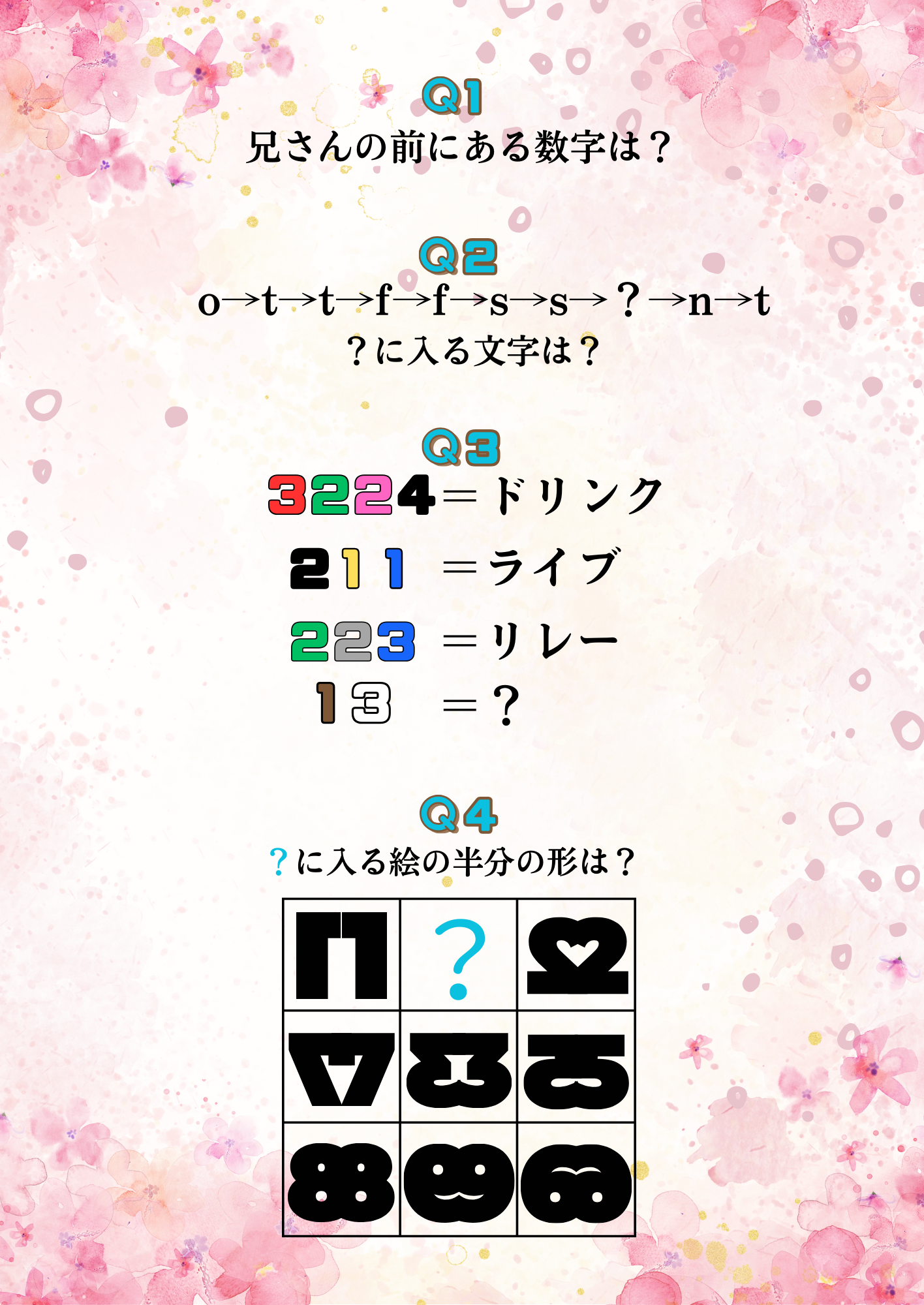 例 Q1の答えが3 Q2の答えがF Q3の答えが4 Q4の答えがt だった場合