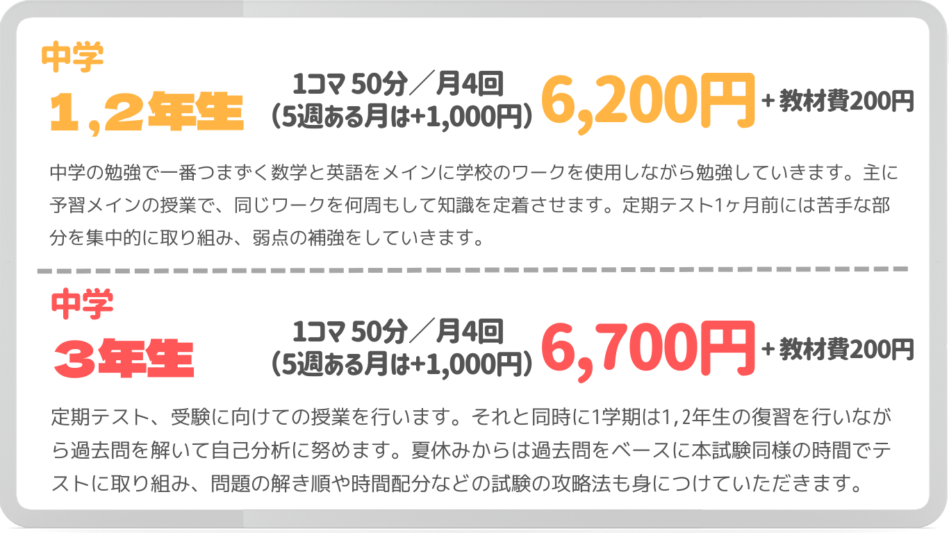 | ②授業料変更なし | 大変恐縮ではございますが、2024年4月1日より授業料を値上げさせていただくこととなりました。ただし、3/31までにご入会していただいた方はクラス変更があるまでは変更前の学年区分の価格でご案内致しますので、お早めにご入会をお願い致します。 ![]() |