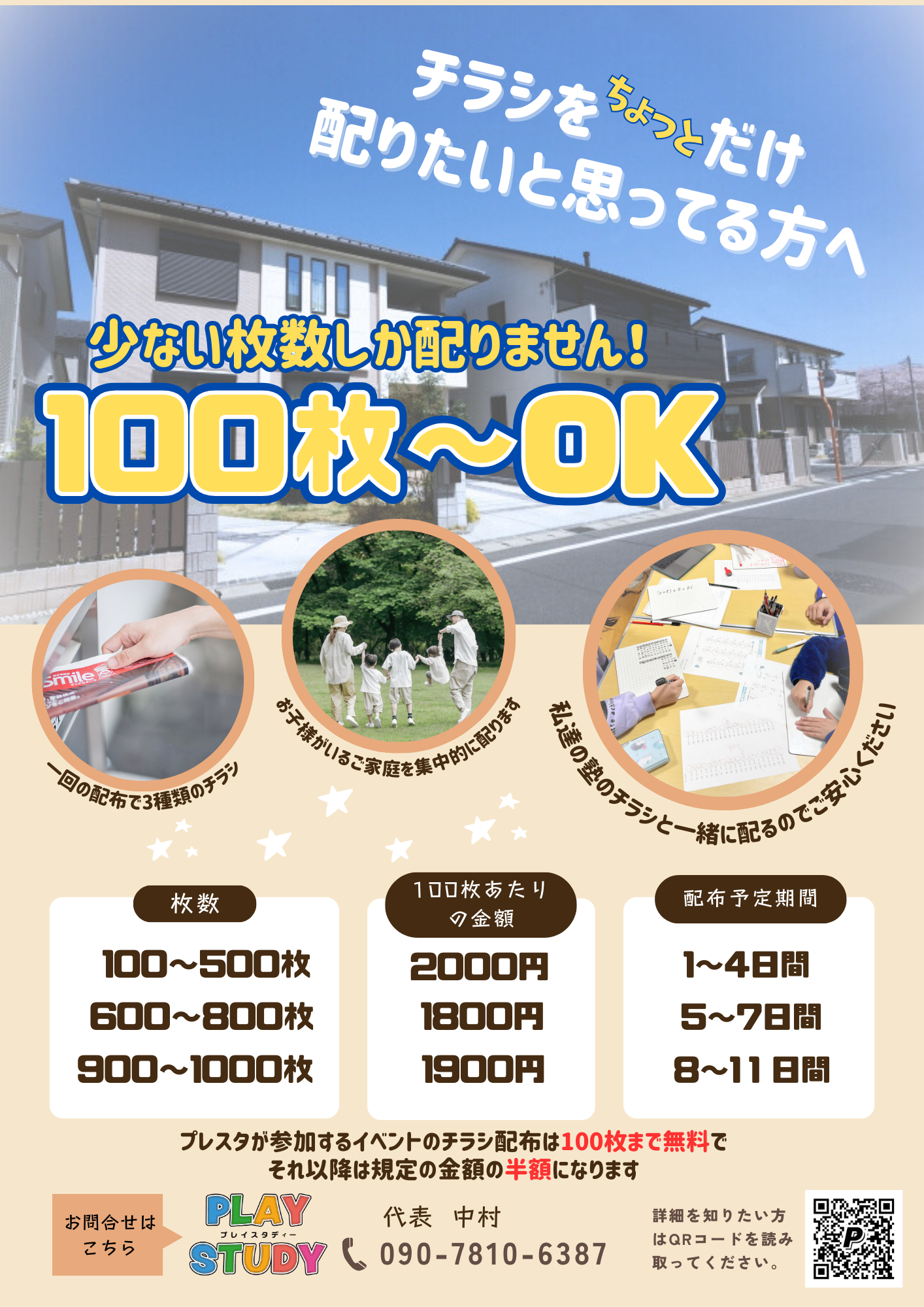100〜1000枚限定でプレスタのチラシと一緒に配らせていただきますので、お子様がいるご家庭を中心にポスティングします